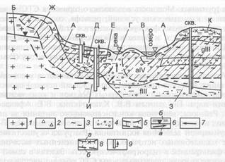 А – надмерзлотные водысезонно-талого слоя; Б – воды сквозного дождевально-радиационного талика; В – надмерзлотные воды подозерного несквозного талика; Г – воды сквозного подруслового талика; Е – межмерзлотные воды; Ж – подмерзлотные воды неконтактирующие безнапорные; З – подмерзлотные воды неконтактирующие напорные; И – подмерзлотные воды контактирующие напорные; К – надмерзлотные воды несквозного дождевально-радиационного талика; 1 – изверженные трещиноватые породы; 2 – щебень и дресва; 3 – суглинки; 4 – пески, галечники; 5 – многолетнемерзлые породы и их граница; 6 – обводненность пород состояния (а), периодическая (б); 7 – направление движения подземных вод; 8 – подошва сезонно-талого слоя (б) и сезонно-мерзлого слоя (а); 9 – скважины, стрелкой показана глубина появления и установившийся уровень подземных вод