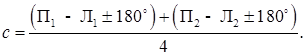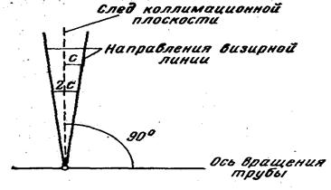 2. Визирная ось зрительной трубы V-V1 должна быть перпендикулярна к оси вращения трубы H - H1 (рис. 2). Методика поверки зависит от особенностей отсчетной системы прибора. Теодолит с односторонним отсчетным устройством (мы используем теодолит ТЗО) устанавливаем по цилиндрическому уровню. Зрительную трубу переводим в положение КП (вертикальный круг справа от окуляра) и визируем на удаленную, четко видимую точку (угол дверного проёма), расположенную приблизительно в горизонтальном направлении. Наведя вертикальную нить на изображение точки, берем отсчет П1 по горизонтальному кругу. Отпустив закрепительный винт, переводим трубу через зенит. Освободив алидаду, наводим трубу на ту же точку и при втором положении вертикального круга КЛ (круг слева) берем отсчет Л1 по горизонтальному кругу. Отпустив закрепительный винт подставки теодолита, поворачиваем его верхнюю часть вместе с лимбом на 180°. После этого повторяем указанные наведения и берем новые отсчеты П2 и Л2. Вычисляем угловую величину с неперпендикулярности осей. Угол с называют коллимационной погрешностью