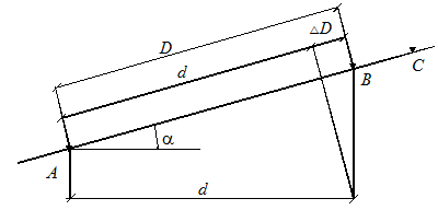 Вдоль заданного направления АС, расположенного на поднимающемся скате (н > 3є), требуется построить линию, горизонтальное проложение которой dАВ = 34,75 м (рис. 15). Над точкой А устанавливается теодолит и приводится в рабочее положение, измеряется вертикальный угол наклона ската н и задается створ линии АС. В этом створе укладывают мерную ленту и закрепляют колышком расстояние, равное 34,75 м. Затем вычисляют поправку