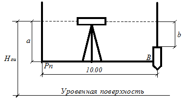 Нивелированием «из середины» снимают отсчет а, вычисляют горизонт инструмента и отсчет по рейке b: