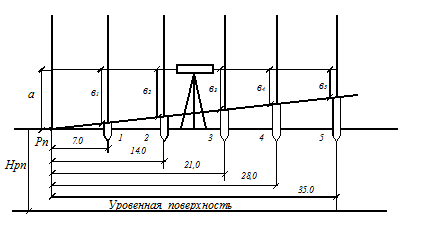 Направление створа задается теодолитом, с его помощью устанавливают колышки в точках 1, 2, 3, 4, 5, расстояние между которыми равно 7,0 м. Дальнейшее решение задачи сводится к построению ряда точек заданной высоты. Абсолютные высоты определяются через уклон: