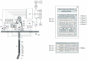 Если установлен пульсатор 43, создающий гидравлические импульсы бурового раствора, то информация об инклинометрических параметрах и с забойных технологических датчиков может быть передана по гидравлическому каналу связи на датчик давления 10 и далее, к преобразовательному комплексу 18 и в компьютер 17. По информации с датчиков расхода 11, плотности 12 и датчика наличия газовой фазы 13, поступающей также через преобразовательный комплекс 18, подается в компьютер 17.