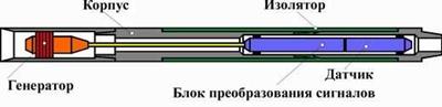 Скважинная часть забойной системы состоит из немагнитного корпуса-переводника, имеющего на обоих концах стандартные резьбы бурового инструмента. Как правило, это 6-10 метровая труба из сплава Д16Т (ЛБТ), либо из титана марки ВТ-4 или сплава 12Х18Т, в которой размещены генератор переменного тока на постоянных магнитах, приводимый во вращение гидротурбиной, и аппаратурный контейнер, внутри которого размещены инклинометрические датчики, блок управления процессом записи, устройство управления коммутацией канала связи. Там же размещены коммутатор канала связи, устройство управления работой системы и источник питания. Для электрического разобщения глубинного прибора и колонны труб, необходимого для ввода сигналов передачи в канал связи, предусмотрена изолирующая вставка из стеклопластика, пропитанного эпоксидной смолой.