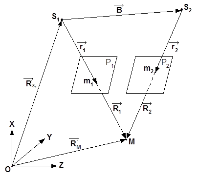 На рис.1 показана стереопара снимков Р1 и Р2, на которых точка местности М изобразилась соответственно в точках m1 и m2. Будем считать, что элементы внутреннего и внешнего ориентирования снимков известны.