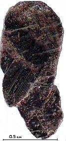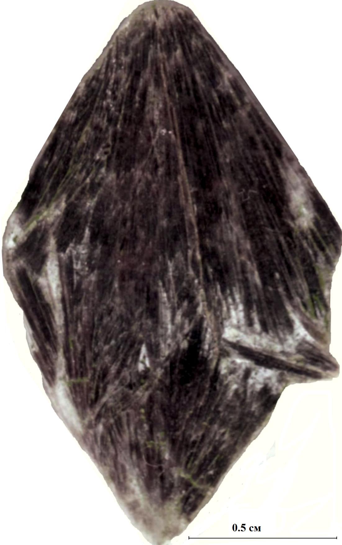Сросток кристаллов темно-серого цвета до черного, размер 1,5Ч0.6 см. Есть включения кварца, изометричные, светло-серого цвета, размером 0,05-0,1 мм. Черный цвет кристалла обусловлен большим количеством включений титаномагнетита. На темном фоне светлые полосы, которые заполнены этими же включениями, но в меньшем количестве. В светлых частях кристалла под бинокуляром наблюдаются включения слюды. Кианит является реликтовым, так как наблюдаются «следы» текстуры предшествующей породы, предположительно сланца.