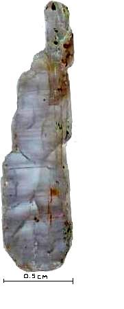 Зональный, светло – голубого цвета по краям, внутри безцветный, размер 1,5Ч0.5 см. Включения черные, очень мелкие, единичные. Кристалл практически чистый. Наблюдается отложение лимонита по трещинам. Присутствуют единичные тонкие вростки красного рутила (0,05 мм). Присутствуют очень мелкие газово-жидкие включения, диагностика которых затруднена.