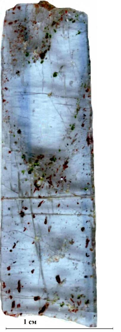 Кристалл светло-голубого цвета (2,4Ч0.7 см), на индивиде сохранилась одна грань. Секториальность определяется различием цвета, в центре кристалла расположен светлый «стержень» (светло-голубой). В кристалле наблюдаются включения красного рутила – тонкопризматического (0,05мм), а также темные мелкие включения. Включения расположены ориентированно, в виде полос – текстура унаследованная от предшествующей породы.