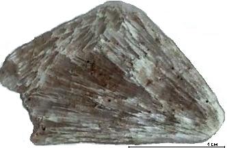 Расщепленные кристаллы, размером по удлинению около 2 см, серовато-желтого цвета. Наблюдаются включения темно-красного рутила ( < 0,5 мм), просвечивающего, с алмазным блеском. В кристалле, между блоками расщепления имеются скопления белой слюды - мусковита.