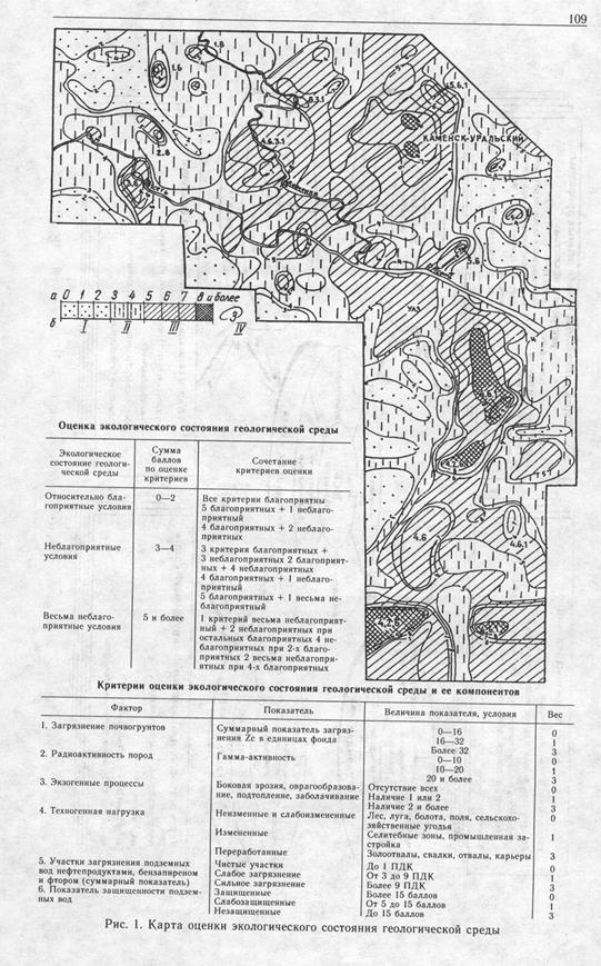 Карта оценки экологического состояния ГС представлена на рис. 7. Анализ результатов экогеологического картирования позволяет установить основные закономерности изменения картируемой территории и оценить не только качественно, но и количественно эти изменения. Так, например, анализ 2-го листа показал, что на исследуемой территории площади с относительно благоприятными условиями составляют всего 13.7%, площади с неблагоприятными условиями – 37%, а с весьма неблагоприятными условиями – 49,3%. Среди участков с весьма неблагоприятными условиями селитебные зоны, т.е. зоны жилищной застройки, составляют 25,8%, промышленные – 11,5%, шламоотстойники – 5,5%. Сильное загрязнение наблюдается в долинах рек района (Исеть, Каменка, Исток и др.)