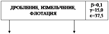 Схема отработки и обогащения оловянных руд с рассчитанными технологическими показателями по отдельным этапам представлена на рисунке, из которого следует, что из всей массы металла, содержащегося в эксплуатационном блоке, в товарный концентрат извлекается всего 25,6%, а 74,4% теряется в отвалах некондиционной руды и хвостохранилище.