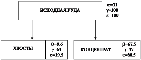 Если выходы продуктов неизвестны, но имеются данные о составе, например, исходной руды, концентрата и хвостов, то, используя выражения (3) и (5) или (4) и (5), легко получить выражения для расчёта величины извлечения интересующего компонента руды соответственно в концентрат