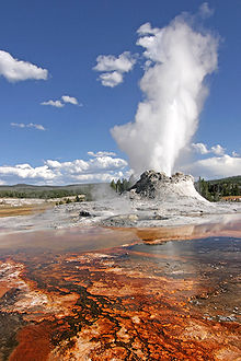 Гейзеры. Извержение паров воды (гейзеры) также является характерной особенностью поствулканической фазы. По мере развития поствулканического процесса, а также по мере удаления от очага выделение водяных паров сменяется выбросами горячей, обычно сильно минерализованной воды в виде горячих и подогретых источников. Источники бывают постоянно действующие или периодически выбрасывающие воду. Последние называются гейзерами (рис.4) В 1941 г. на Камчатке в долине р. Гейзерной было обнаружено более 20 активно - действующих гейзеров. Действие самого крупного из этих гейзеров, Великана, по описанию Т. И. Устиновой, происходило следующим образом: из небольшой, чашеобразной впадины, именуемой грифоном, выделялся горячий пар. Через 11 минут на дне грифона появилась горячая вода, с силой выбрасываемая из канала. Еще через 11 минут вода заполнила весь грифон и, то повышаясь, то понижаясь, начала толчками переливаться через край его. Затем она была вытолкнута в виде полутораметрового фонтана, после чего из грифона вырвался громадный столб воды и пара высотой 50 м. Клубы пара поднялись вверх, до высоты 300 м, и затем рассеялись, столб воды держался в течение 2 минут, а затем, постепенно сокращаясь, исчез. Грифон стал пустым, только со склонов в него стекла вода. Через 11 минут вновь появляется вода, начинается новый цикл деятельности источника. Периодичность извержений гейзеров бывает удивительно постоянна. Интервалы между извержениями колеблются у различных гейзеров от 10 минут до 5,5 часа. Температура воды у выхода из канала равняется плюс 94—99°. Вода гейзеров бывает обычно минерализована, она содержит соли натрия, магния, кальция, кремневой кислоты. В связи с этим вокруг гейзеров часто наблюдаются отложения солей в виде пористых известковых или кремнистых туфов. Гейзеры известны в Исландии, Новой Зеландии. Особенно многочисленны они в Иеллоустонского национальном парке в США, где имеется около 85 гейзеров и несколько тысяч горячих источников. Механизм работы гейзеров объясняется следующим образом: в период покоя у дна канала гейзера скапливается вода с температурой выше 100°, находящаяся под большим давлением вышележащего столба воды и поэтому не превращающаяся в пар в нижних частях канала. В более высоких частях вода начинает кипеть и выбрасываться вверх, вследствие чего давление уменьшается, наступает критический момент, когда перегретая вода, мгновенно обратившись в пар, производит извержение. Вода, выброшенная взрывом паров, частично возвращается в жерло гейзера и, понижая в нем температуру, прекращает извержение пара.