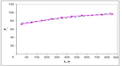 На основании проведенных расчётов построены эмпирический (по данным столбцов li и αi табл. 3) и теоретический (по корреляционному уравнению) графики зависимости азимутального угла от глубины скважины (рис. 2).