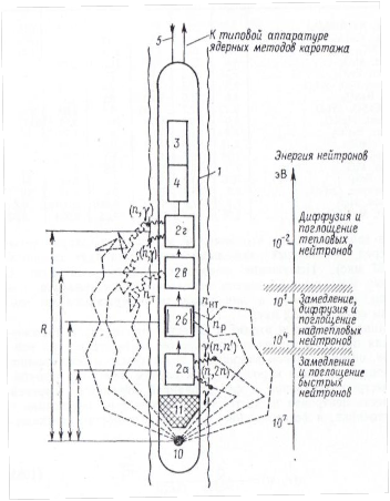 В большинстве нейтронных методов каротажа используются радиоизотопные полониево-бериллиевые источники, испускающие быстрые нейтроны с энергией ~4 МэВ. Между детекторами 2 и источником 10 располагается экран 11 из парафина и свинца, защищающий детектор от воздействия прямого нейтронного и γ-излучения источника.
