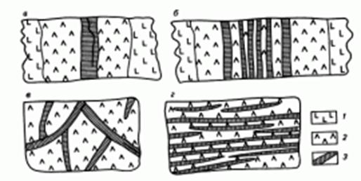 Рис. 1. Типы жилкования хризотил-асбеста (текстуры). а - простая отороченная жила, в центре жилы видна просечка; б - сложная отороченная жила; в - руда типа мелкой сетки; г - руда мелкопрожильная. 1 - гарцбургит, 2 - серпентинит, 3 - жилки хризотил-асбеста.