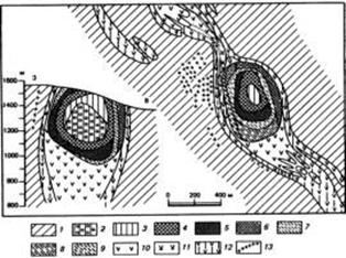 2 - серпентинизированные гарцбургиты и серпентиниты с асбестоносностью типа бедных отороченных жил (ядро); 3 - серпентинизированные гарцбургиты и серпентиниты с асбестоносностью типа простых отороченных жил; 4 - серпентиниты и серпентинизированные гарцбургиты с асбестоносностью типа крупной сетки; 5 - серпентиниты с асбестоносностью типа мелкой сетки; 6 - серпентиниты периферийной зоны с асбестоносностью типа мелкой сетки; 7 - серпентиниты с асбестоносностью типа ориентированных просечек; 8 - серпентиниты смешанной зоны с асбестоносностью типа ориентированных и сетчатых просечек; 9 - серпентиниты с асбестоносностью типа сетчатых просечек; 10 - голубовато-серые груборассланцованные серпентиниты; 11 - серовато-зеленые груборассланцованные карбонатизированные серпентиниты; 12 - темно-зеленые интенсивно рассланцованные карбонатизированные и серпофитизированные серпентиниты; 13 - дайки гранит-порфиров Качойского интрузивного комплекса.