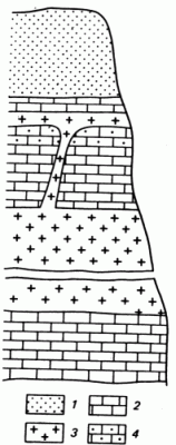 Рис. 3. Схематический разрез Аризонского месторождения хризотил-асбеста (по Б.Я.Меренкову, М.В.Муратову). 1 - песчаник; 2 - известняк; 3 - диабаз; 4 - серпентинит (с асбестом).