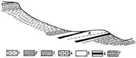 Рис. 5. Схематический геологический разрез месторождения амфибол-асбеста в Южной Африке (по Б.Я.Меренкову, М.В.Муратову). 1 - метаморфические сланцы; 2 - кварцит; 3 - конгломерат; 4 - доломит; 5 - железистый кварцит; 6 - диабаз (пластовые залежи); 7 - главная доломитовая серия; А - главный асбестоносныйый горизонт.
