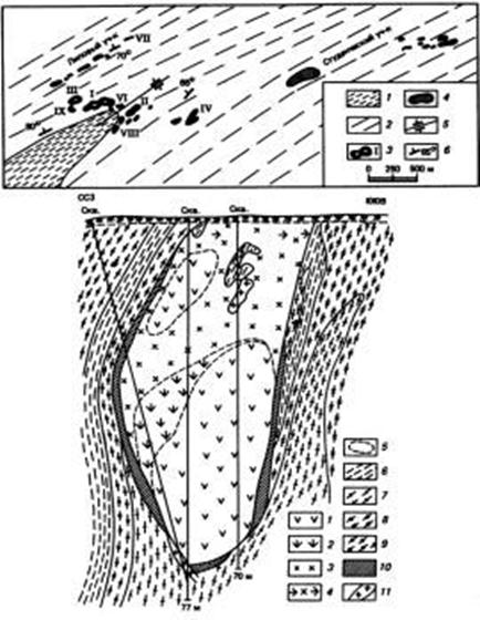 Рис. 2. Геологическая карта и разрез Молодежного гипербазитового массива (по К.Г.Башта). 1 - келянская толща (сланцы хлорит-серицит-кварцевые, эпидот-альбит-хлоритовые, кварц-карбонатные, реже рассланцованные эффузивы);