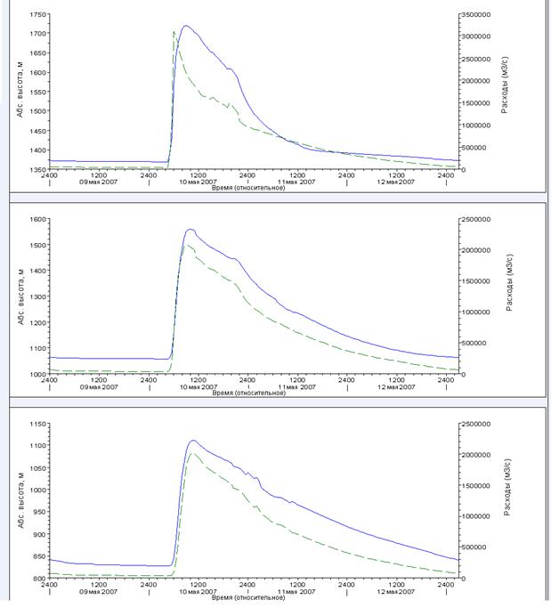 Рис. 2. Рассчитанные расходы (пунктирная линия) и уровни воды (сплошная линия) во время паводка на р. Чуя на расстоянии соответственно 10, 50 и 100 км ниже места прорыва