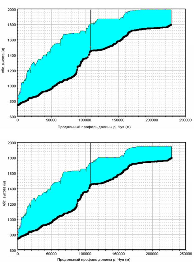 Рис. 3. Рассчитанные профили водной поверхности на участке моделирования через 5 и 10 часов после начала разрушения плотины. По оси абсцисс показано расстояние от места слияния рек Чуя и Катунь, по оси ординат – высотные отметки
