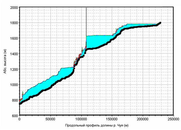 Рис. 4. Рассчитанные профили водной поверхности на участке моделирования через 1 и 2 суток после начала разрушения плотины. По оси абсцисс показано расстояние от места слияния рек Чуя и Катунь, по оси ординат – высотные отметки