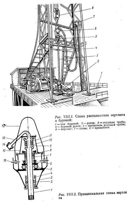 На рис. VIII. 1 показана схема расположения вертлюга в буровой при бурении.