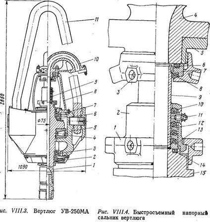 Быстросъемное напорное уплотнение (рис. VIII.4), применяемое в вертлюге УВ-250МА, обеспечивает подачу в ствол вертлюга бурового раствора под давлением до 25 МПа. Раствор от подвода 4 вертлюга поступает через напорную трубу 9, расположенную в стволе 15 вертлюга. Эта труба жестко не закреплена и является как бы плавающей. На ее верхнем конце установлена шпонка, входящая в паз кольца 7, неподвижно прикрепленного верхней нажимной гайкой 3 к втулке 5.