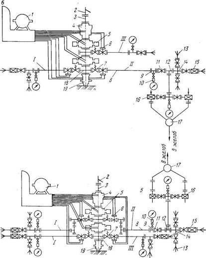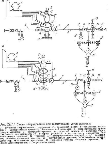 Линия дросселирования служит для слива бурового раствора и отбора флюидов из скважины с противодавлением на пласт, а также для закачки в скважину жидкости с помощью цементировочных агрегатов. В схеме на рис. XIII.1, г, применяемой при бурении скважин с повышенной опасностью нефтегазопроявлений, верхняя линия дросселирования служит резервной.