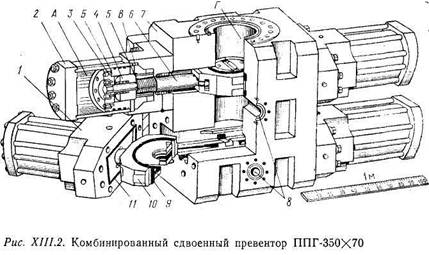 Превентор, выпускаемый ВЗБТ (рис. ХШ.2) состоит из стального литого корпуса 7, к которому на шпильках крепятся крышки / четырех гидравлических цилиндров 2. В полости А цилиндра 2 размещен главный поршень 3, укрепленный на штоке 6. Внутри поршня размещен вспомогательный поршень 4, служащий для фиксации плашек 10 в закрытом состоянии отверстия Г ствола скважины. Для закрытия отверстия плашками жидкость, управляющая их работой, поступает в полость А, под действием давления которой поршень перемещается слева направо.