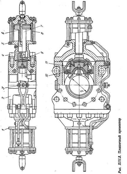 Каждая плашка перемещается поршнем 6 гидравлического цилиндра 8. Масло от коллектора 3 по стальным трубкам и через поворотное ниппельное соединение под давлением поступает в гидроцилиндры. Полость плашек превентора в зимнее время (при температуре —5°С и ниже) обогревается паром, подаваемым в паропроводы. Поршень со штоком, крышка и цилиндры уплотняются при помощи резиновых колец.