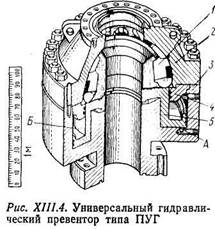 Универсальный превентор предназначен для повышения надежности герметизации устья скважины. Его основной рабочий элемент — мощное кольцевое упругое уплотнение, которое при открытом положении превентора позволяет проходить колонне бурильных труб, а при закрытом положении-—сжимается, вследствие чего резиновое уплотнение обжимает трубу (ведущую трубу, замок) и герметизирует кольцевое пространство между бурильной и обсадной колоннами. Эластичность резинового уплотнения позволяет закрывать превентор на трубах различного диаметра, на замках и УБТ. Применение универсальных превенторов дает возможность вращать и расхаживать колонну при герметизированном кольцевом зазоре.