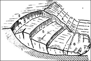 Рисунок 1 – Схема идеального оползня, где: 1 – поверхность скола; 2 – оползневой цирк; 3– стенка отрыва; 4 – боковая стенка; 5 – поперечные трещины; 6 – оползневые валы выпирания; 7 – основание оползневого откоса [2]