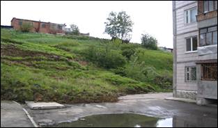 Кроме этого, в отчетный период наблюдалась активизация оползневых процессов на участке мкр."Солнечный", создавая угрозу расположенным вблизи жилым домам (рисунок 6), а также производственным зданиям и сооружениям.