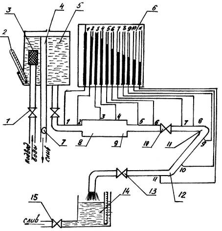 В напорный бак вода непрерывно подается из водопровода через вентиль 1 и успокоительную сетку 3. Излишки воды из бака сливаются через переливную трубу 4. Для контроля температуры воды в баке имеется термометр 2. Расход воды через местные сопротивления регулируется вентилем 13. После прохождения экспериментального участка вода сливается в мерный бак 14, на выходе из которого имеется кран 15.