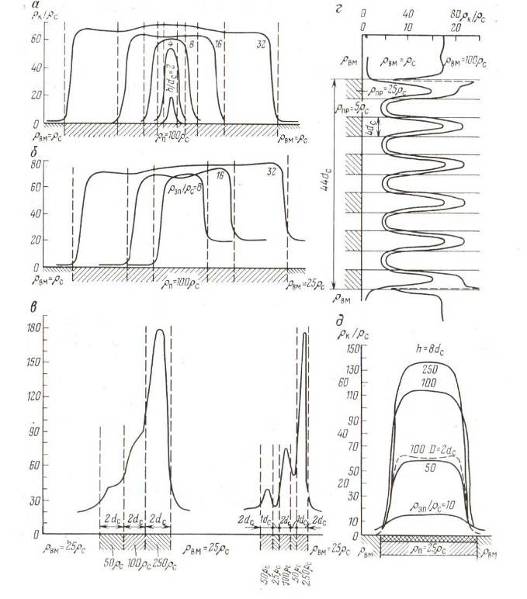 На рис. 5 показаны характерные кривые сопротивления трехэлектродного бокового каротажа. Как видно, при одинаковом удельном сопротивлении вмещающих пород кривые КС против однородных пластов высокого сопротивления отмечаются максимумами, которые принимают формы острой пики против тонких пластов (h≤4dc); против мощных пластов (h>8dc) наблюдается горизонтальный интервал в средней части (рис. 4,а). Если породы, подстилающая пласт и перекрывающая его, имеют различное сопротивление, то максимум против пласта высокого сопротивления становится асимметричным, наблюдается снижение сопротивления со стороны породы меньшего сопротивления (рис. 4,б). При постепенном изменении сопротивлений отдельных пластов форма кривой принимает ступенчатый вид (рис. 4, в). Против пачки пластов, представленной породами разного сопротивления, кривая характеризуется чередованием симметричных максимумов и минимумов (рис. 4, г). Против проницаемых пластов с проникновением ПЖ форма кривых КС почти соответствует форме кривых для однородных пластов. С увеличением диаметра зоны повышающего проникновения наблюдается заметное увеличение сопротивления (рис. 4,д).