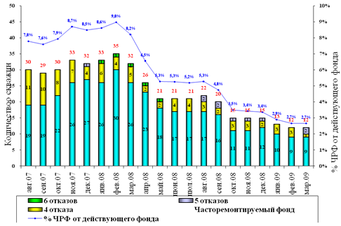 В результате проведенных мероприятий по сокращению ЧРФ за январь 2009 г. видно, что в феврале 2009 г. количество скважин ЧРФ сократилось с 13 до 12 (рисунок 5.5) и количество отказов ЧРФ сократилось с 30 до 29 (рисунок 5.6), в результате чего в марте 2009 г. наблюдается рост межремонтного периода скважин (МРП), а также рост средней наработки на отказ (СНО).