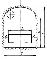 Схема к расчету размеров поперечного сечения при использовании скреперного оборудования в выработке прямоугольно-сводчатой формы сечения.
