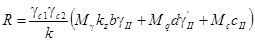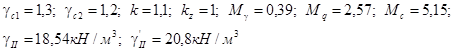 где γс1 и γс2 - коэффициенты условий работы, принимаемые по СНиП 2.02.01-83; k - коэффициент, принимаемый равным 1, если прочностные характеристики грунта определены непосредственными испытаниями, и 1,1, если приняты по таблицам; Мγ, Мq, Мс - коэффициенты, принимаемые по СНиП 2.02.01-83; kz - коэффициент, принимаемый равным: