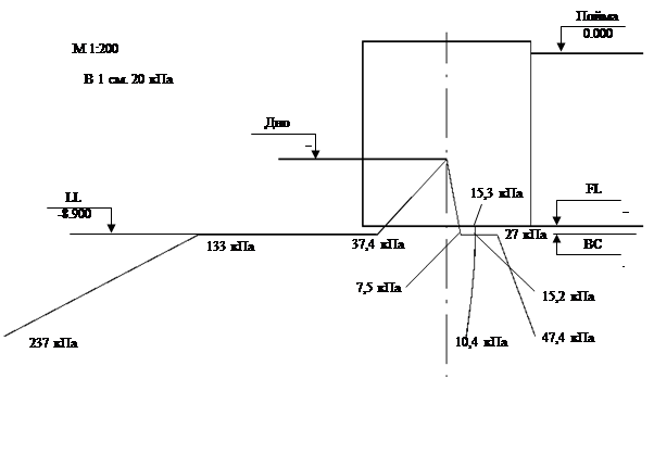 Слева от вертикальной оси, проходящей через центр тяжести подошвы (точка О), строится эпюра давления σzg, от собственного веса с учетом взвешивания песка водой и положения литологической границы LL.