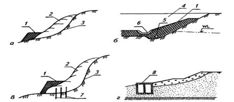 а, б— контрфорс из грунта; в — контрфорс с забивкой удерживающих оползень свай; г — контрфорс в виде железобетонных ящиков, заполненных песком или щебнем; 1 — упорная призма; 2 — тело оползня; 3 — поверхность скольжения; 4 — первоначальная поверхность склона; 5 — дренаж; 6 — лоток водоотвода; 7— сваи; 8 — железобетонный ящик