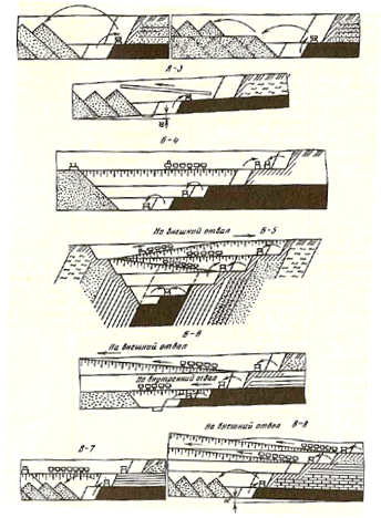 В. Системы разработки с перевалкой и перевозкой вскрыши (с поперечным и продольным перемещением вскрыши в отвалы) |