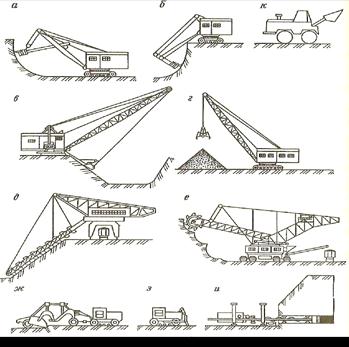 а- прямая мехлопата; б – обратная мехлопата; в – драглайн; г- грейфер; д – цепной многоковшовый экскаватор; е – роторный экскаватор; ж – колесный скрепер; з – бульдозер; и – шнекоуборочная машина; к – погрузчик.