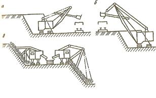 а – с верхнем черпанием и нижней погрузкой; б – с верхним черпанием и верхней погрузкой; в – с верхнем и нижним черпанием и верхней и нижней погрузкой.