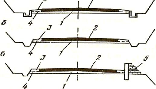 а - в рыхлых породах; б - в скальных породах; в - на съездах; 1 – земляное полотно; 2 – проезжая часть; 3 – обочина; 4 – водоотливное сооружение; 5 – ограждение.