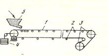 1 - конвейерная лента; 2 - роликоопоры; 3 -приводные барабаны; 4 - устройство для натяжения ленты; 5 - загрузочное устройство.