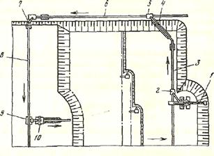 1 - экскаватор; 2 - загрузочное устройство; 3 - забойный передвижной конвейер; 4 -наклонный конвейер; 5 - загрузочное устройство; 6 - полустационарный конвейер; 7 -самоходный перегружатель; 8 - отвальный передвижной конвейер; 9 - разгрузочное устройство; 10 – отвалообразователь.