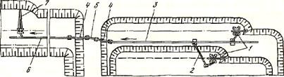Рисунок 6.6 - схема перемещения вскрышных пород во внешние отвалы: 1 - роторные экскаваторы; 2 - перегружатель; 3 - забойный конвейер; 4 - наклонный конвейер; 5 - магистральный конвейер; 6 - отвальный конвейер; 7 - отвалообразователь