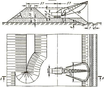 При возведении отвала на равнине первоначальная насыпь сооружается из пород выемки, проводимой вблизи насыпи параллельно ее оси, или из вскрышных пород. В зависимости от типа вскрышных пород и вида карьерного транспорта первичная насыпь может сооружаться драглайнами, мехлопатами, бульдозерами и колесными скреперами (рис. 7.2, 7.3, 7.4, 7.5).