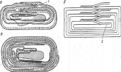 а - петлевая; б - тупиковая; в - спиральная; 1 - петля; 2 – тупик